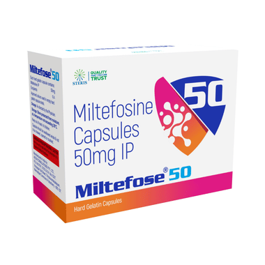 Miltefose 50 Capsule is an antibiotic. It is used in the treatment of kala-azar (a parasitic disease spread by the bite of infected sand flies). It inhibits the growth of the parasite and kills it, thus relieving your infection.Miltefose 50 Capsule should be used in the dose and duration as advised by your doctor. It should be taken with food, preferably at a fixed time to minimize side effects like nausea, vomiting, abdominal pain, and diarrhea. Avoid skipping any doses and finish the full course of treatment even if you feel better. Do not take a double dose to make up for a missed dose. Simply take the next dose as planned. Take plenty of oral fluids to keep yourself hydrated and prevent dehydration.