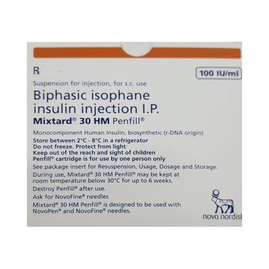 Mixtard 30 HM 100IU/ml Penfill is a combination of two medicines, an intermediate-acting and a short-acting type of insulin. It is used in the treatment of diabetes mellitus (type 1 and 2) to improve blood sugar control both in adults and children. It helps maintain the blood sugar levels in diabetic patients.