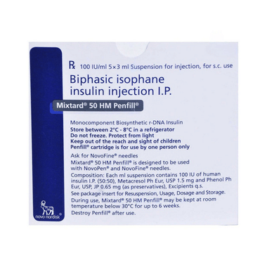 Find out detailed description, uses, directions of use, side effects, warnings and precautions, frequently asked questions about Mixtard 50 HM 100IU/ml Penfill (3ml Each)