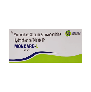 Moncare-L Tablet is a combination medicine used in the treatment of allergic symptoms such as runny nose, stuffy nose, sneezing, itching, swelling, watery eyes, and congestion or stuffiness. It also reduces inflammation in the airways and makes breathing easier.