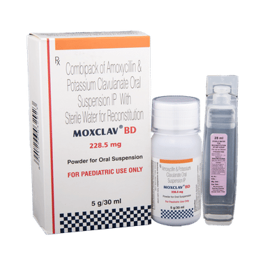 Moxclav BD 228.5mg Powder for Oral Suspension is an antibiotic medicine that helps treat bacterial infections of the ear, nose, throat, chest, lungs, teeth, skin, and urinary tract. It is capable of killing bacteria that have become resistant to other therapies and thus also helps treat tuberculosis that is resistant to other treatments.