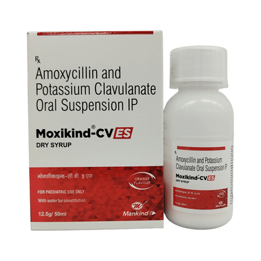 Moxikind CV ES Dry Syrup is a combination of two medicines (amoxycillin and clavulanic acid) used to treat bacterial infections, such as tonsillitis, sinusitis, otitis media, respiratory tract infections, urinary tract infections, boils, abscesses, cellulitis, wound infection, bone infection, and oral cavity infections. The medicine works by killing the harmful bacteria that cause infections.