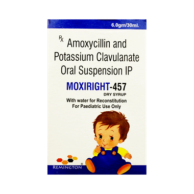 Moxiright 457 Dry Syrup is an antibiotic medicine that helps treat bacterial infections of the ear, nose, throat, chest, lungs, teeth, skin, and urinary tract. It is capable of killing bacteria that have become resistant to other therapies and thus also helps treat tuberculosis that is resistant to other treatments.