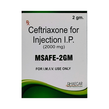 Msafe 2GM Injection is a medicine used to treat bacterial infections in your body. It is effective in infections of the brain (e.g., meningitis), lungs (e.g., pneumonia), ear, urinary tract, skin and soft tissues, bones and joints, blood, and heart.Msafe 2GM Injection may also be used to prevent infections during surgery. It is given as a drip (intravenous infusion) or as an injection directly into a vein or a muscle under the supervision of a doctor. Your doctor will decide the correct dose for you. This medicine will be given to you regularly at evenly spaced intervals as per the schedule prescribed by your doctor. Do not skip any doses and finish the full course of treatment even if you feel better. Stopping the medicine too early may lead to the return or worsening of the infection.
