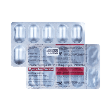 Mycoclear SB 130 Capsule is used to treat fungal infections caused by Trichophyton spp., Microsporum spp., and Epidermophyton floccosum. The infections caused could be ringworm infection, infection of feet, or infection in groin and buttocks. This medicine also treats persistent infection of fingernails and toenails, persistent candida (yeast) infections of vagina or candida (yeast) infections of the mouth or throat in patients with lower resistance to disease. It is also used in the treatment of cryptococcal infection and infections caused by histoplasma, aspergillus and blastomyces.