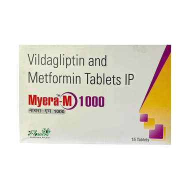 Myera-M 1000 Tablet is a combination of two anti-diabetic drugs: metformin and vildagliptin. Metformin is an anti-diabetic medicine and belongs to the class of biguanides. It lowers the glucose production in the liver, delays glucose absorption from the intestines, and increases the body's sensitivity to insulin. Vildagliptin inhibits the enzyme DPP4 and increases the release of insulin from the pancreas. This combination is not advised for patients below 18 years of age.