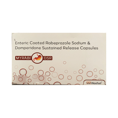 Myrabi DSR Capsule is a combination medicine used to treat gastroesophageal reflux disease (acid reflux). It works by relieving the symptoms of acidity, such as heartburn, stomach pain, or irritation. It also neutralizes the acid and promotes easy passage of gas to reduce stomach discomfort.