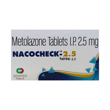 Nacocheck 2.5 Tablet is used to help the body remove excess salt and water. It is prescribed for swelling (edema) caused by heart failure or kidney problems, including nephrotic syndrome, and can also be used to help control high blood pressure, either alone or with other blood pressure medicines.