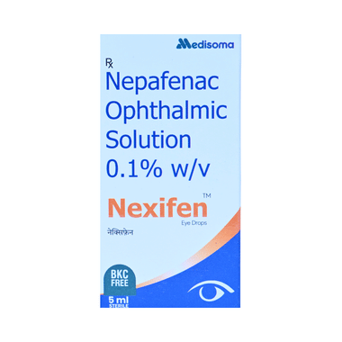 Nexifen Eye Drop BKC Free is a pain-relieving medicine used to treat pain and inflammation associated with cataract surgery. It blocks and reduces the release of certain chemicals in the eye that cause pain and swelling. This makes the healing process after eye surgery more comfortable and helps the eye heal faster.Forever wash your hands before using Nexifen Eye Drop BKC Free. Employ only the number of drops that your doctor has prescribed and wait for about five minutes between each drop. If you wear contact lenses, remove them before using the drops and wait for at least 15 minutes before putting them back in. You should not touch the tip of the dropper or bottle. This may lead to infection.