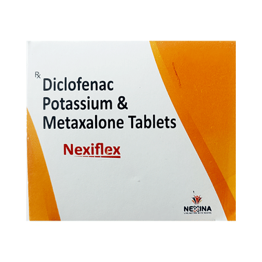 Nexiflex Tablet is a combination of two medicines: Diclofenac and Metaxalone. This combination helps to relieve muscle pain. It works by relaxing muscles by acting on central nervous system and lowering chemical substance in the body that causes pain and inflammation.
