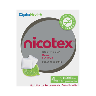 Nicotex Nicotine Gum 4mg Chewing Gums Paan can be used to help you stop smoking completely or cut down the amount you smoke. Stopping smoking is hard and you need to be ready and committed. But quitting is one of the most important things you can do to improve your health and live longer. This medicine should be taken as advised by doctor as it can be habit forming. In case you have missed any dose, take it as soon as you remember it. Do not skip any doses and finish the full course of treatment. However, before taking this medicine it is better to inform doctor if you are suffering from any heart, liver or kidney disease. You must not smoke while using this medicine as it can result in dangerous effects.