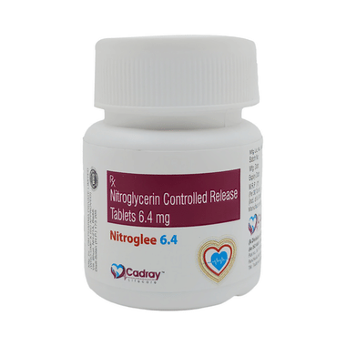 Nitroglee 6.4 Tablet CR is used to treat and prevent heart-related chest pain (angina). Angina occurs when the heart muscle is not getting enough blood. This medicine works by relaxing and widening blood vessels so blood can flow more easily to the heart.Nitroglee 6.4 Tablet CR should be taken in the dose and duration as advised by your doctor. It may be taken with or without food, preferably at a fixed time each day. Do not consume more than the recommended dose, as this may have harmful effects on your body. You can develop tolerance to this medicine over time, which means that the same dose becomes less effective. You have to stick to a really specific dosing schedule to prevent this from happening.