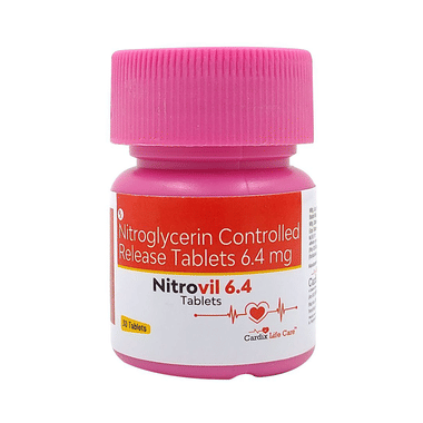 Nitrovil 6.4mg Tablet is used to treat and prevent heart-related chest pain (angina). Angina occurs when the heart muscle is not getting enough blood. This medicine works by relaxing and widening blood vessels so blood can flow more easily to the heart.Nitrovil 6.4mg Tablet should be taken in the dose and duration as advised by your doctor. It may be taken with or without food, preferably at a fixed time each day. Do not consume more than the recommended dose, as this may have harmful effects on your body. You can develop tolerance to this medicine over time, which means that the same dose becomes less effective. You have to stick to a really specific dosing schedule to prevent this from happening.