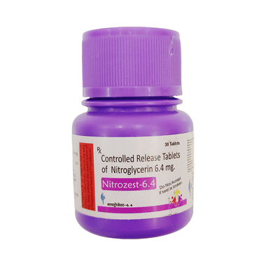 Nitrozest 6.4 Tablet CR is used to treat and prevent heart-related chest pain (angina). Angina occurs when the heart muscle is not getting enough blood. This medicine works by relaxing and widening blood vessels so blood can flow more easily to the heart.Nitrozest 6.4 Tablet CR should be taken in the dose and duration as advised by your doctor. It may be taken with or without food, preferably at a fixed time each day. Do not consume more than the recommended dose, as this may have harmful effects on your body. You can develop tolerance to this medicine over time, which means that the same dose becomes less effective. You have to stick to a really specific dosing schedule to prevent this from happening.