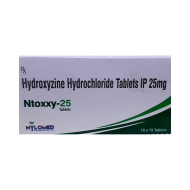 Ntoxxy 25 Tablet belongs to a group of medicines called antihistamines, which means it is an anti-allergy medicine. It is used to treat various allergic skin conditions (e.g., eczema, dermatitis, allergies, rash). Ntoxxy 25 Tablet effectively reduces symptoms such as swelling, itching, and redness associated with such conditions. It also helps relieve excessive anxiety or worry in people who are supposed to undergo surgery or have recently undergone surgery. It calms the brain and makes such people feel better.
