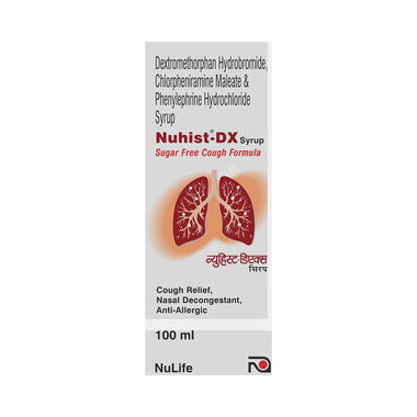 Nuhist-DX Syrup Sugar Free is a medicine used in the treatment of the common cold and cough. It can provide quick relief from cough and common cold symptoms like runny nose, stuffy nose, sneezing, watery eyes, and congestion or stuffiness.Nuhist-DX Syrup Sugar Free may be taken with or without food in the dose and duration advised by your doctor. The dose you receive will depend on your condition and how you respond to the medicine. Continue taking this medicine for as long as your doctor recommends. If you stop treatment too early, your symptoms may return, and your condition may worsen. Inform your healthcare provider about all other medicines you are taking, as some may affect, or be affected by, this medicine.