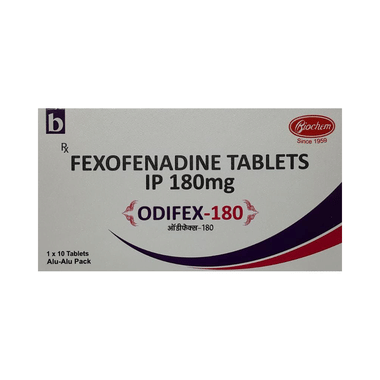 Odifex 180 Tablet is an anti-allergy medicine used in the treatment of allergic symptoms such as runny nose, congestion or stuffiness, sneezing, itching, swelling, and watery eyes. It also helps treat skin allergies with itching, redness, or swelling.