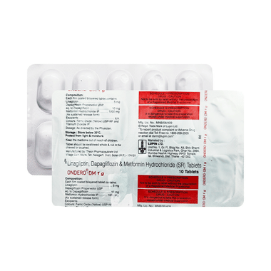 Take Ondero-DM 10mg/5mg/1000mg Tablet exactly as prescribed by your doctor. It may be taken with or without food, once or twice daily. For maximum benefits, take it at the same time each day to maintain consistent blood sugar control. Monitor your blood sugar levels regularly and follow any dietary and lifestyle recommendations from your doctor.