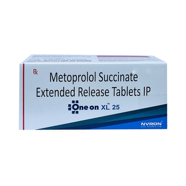 One ON XL 25 Tablet belongs to a group of medicines called beta-blockers. It is used to treat high blood pressure (hypertension), angina (heart-related chest pain), and irregular heart rhythms (arrhythmia). It also helps prevent migraines, future heart attacks, and strokes.One ON XL 25 Tablet may be prescribed alone or together with other medications. The dose and frequency will depend on what you are taking it for and the severity of your condition. It may be taken on an empty stomach or with a meal, but take it regularly at the same time each day to get the maximum benefit. It may take several weeks before you get the full benefit of this medicine, and you may need to take it for the rest of your life. However, it is important to continue taking it even if you feel well. Most people with high blood pressure do not have symptoms. If you stop taking it, your condition may worsen.