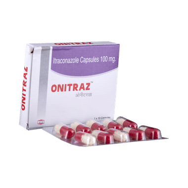 Onitraz Capsule is used to treat fungal infections caused by Trichophyton spp., Microsporum spp., and Epidermophyton floccosum. The infections caused could be ringworm infection, infection of feet, or infection in groin and buttocks. This medicine also treats persistent infection of fingernails and toenails, persistent candida (yeast) infections of vagina or candida (yeast) infections of the mouth or throat in patients with lower resistance to disease. It is also used in the treatment of cryptococcal infection and infections caused by histoplasma, aspergillus and blastomyces.