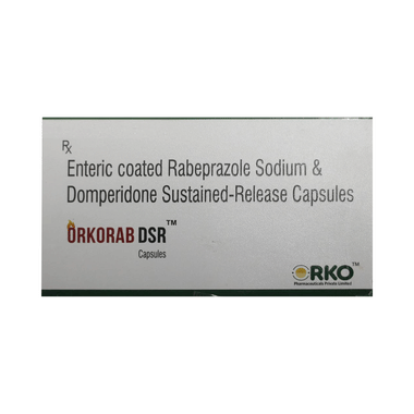 Orkorab DSR Capsule is a combination of two medicines: Domperidone and Rabeprazole. This combination is used to treat acidity and heartburn or gastroesophageal reflux disease (GERD); a condition where the acid in the stomach flows back up into the food pipe (esophagus). It is also used to treat gastric and duodenal ulcers. Domperidone helps to control vomiting by increasing the movement of the gut, allowing the food to move more easily through the stomach.