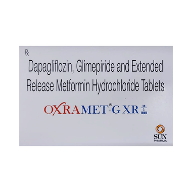 OXRAmet G 10mg//1000mg Tablet XR is a combination of three medicines used to treat type 2 diabetes mellitus. It helps control the high blood sugar levels seen in diabetes. This reduces the chances of serious complications of diabetes and also helps prevent heart disease.OXRAmet G 10mg//1000mg Tablet XR may be taken with or without food. Take it at the same time every day, this will help you remember to take it. The dose will be decided by your doctor. Do not stop taking it without asking your doctor. If you do, your blood sugar levels may increase and put you at risk of serious complications like kidney damage and blindness. This medicine is only part of a treatment program that should include a healthy diet, regular exercise, and weight reduction as advised by your doctor.