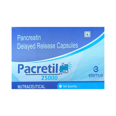Pacretil 25000 Capsule DR is used to treat pancreatic enzyme deficiency. It is a pancreatic enzyme supplement that helps in digestion. This medicine also reduces stool frequency and stomach discomfort.