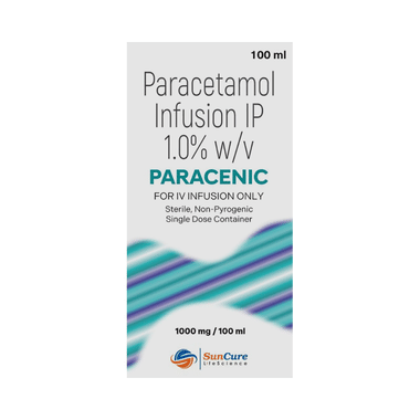Paracenic Infusion helps in relieving moderate pain and reducing fever. It effectively alleviates pain and reduces fever for the short-term in cases following surgery or in cases where oral administration is not possible.Paracenic Infusion is administered by a doctor or a nurse and should not be self-administered. Depending on the severity of your underlying illness, your doctor will decide the precise dose and schedule as per which this injection is to be given. It starts working within one hour. Inform your doctor if you are also taking other medications containing paracetamol to avoid an overdose. You should let your doctor know if your pain or fever does not subside.