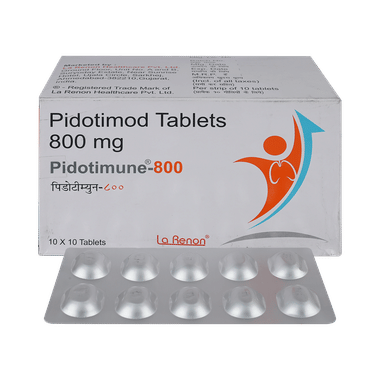 Pidotimune 800 Tablet is either given alone or in combination with some other medicines. It should not be used to treat any existing infections of the respiratory tract. It should be taken with or without food, but better to take it at the same time every day to attain the most benefits. The dose and how often you take it depends on what you are taking it for. Your doctor will decide how much you need to improve your symptoms. You should take this medicine for as long as it is prescribed for you.