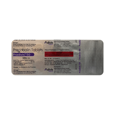 Pradivis 50 Tablet is a medicine used to relieve pain caused by nerve damage (neuropathic pain) due to diabetes, shingles (herpes zoster infection), spinal cord injury, or other conditions. It is also used to treat widespread muscle pain and stiffness in people with fibromyalgia.