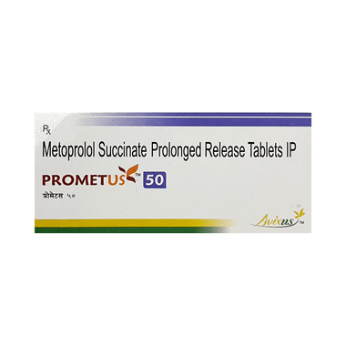 Prometus 50 Tablet PR belongs to a group of medicines called beta-blockers. It is used to treat high blood pressure (hypertension), angina (heart-related chest pain), and irregular heart rhythms (arrhythmia). It also helps prevent future heart attacks, strokes, and migraines.