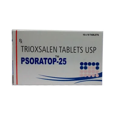 Psoratop 25mg Tablet is used with ultraviolet A (UVA) light therapy to treat skin conditions like vitiligo (to increase skin pigmentation) and sometimes psoriasis. It works as a photosensitizer, making your skin more sensitive to UVA, and promoting repigmentation.