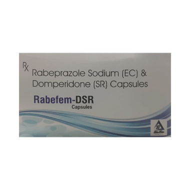 Rabefem-DSR Capsule is a combination of two medicines: Domperidone and Rabeprazole. This combination is used to treat acidity and heartburn or gastroesophageal reflux disease (GERD); a condition where the acid in the stomach flows back up into the food pipe (esophagus). It is also used to treat gastric and duodenal ulcers. Domperidone helps to control vomiting by increasing the movement of the gut, allowing the food to move more easily through the stomach.