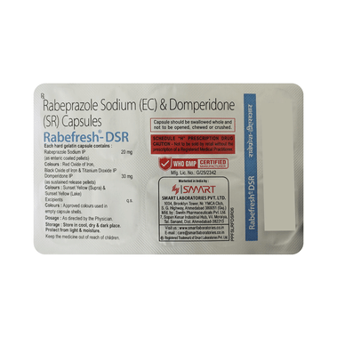 Rabefresh-DSR Capsule is a combination medicine used to treat gastroesophageal reflux disease (acid reflux). It works by relieving the symptoms of acidity, such as heartburn, stomach pain, or irritation. It also neutralizes the acid and promotes easy passage of gas to reduce stomach discomfort.