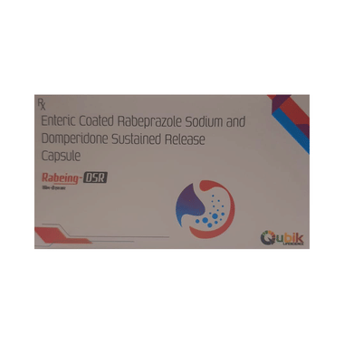 Rabeing-DSR Capsule is a combination of two medicines: Domperidone and Rabeprazole. This combination is used to treat acidity and heartburn or gastroesophageal reflux disease (GERD); a condition where the acid in the stomach flows back up into the food pipe (esophagus). It is also used to treat gastric and duodenal ulcers. Domperidone helps to control vomiting by increasing the movement of the gut, allowing the food to move more easily through the stomach.