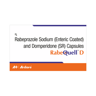 Rabequell D Capsule SR is a combination of two medicines: Domperidone and Rabeprazole. This combination is used to treat acidity and heartburn or gastroesophageal reflux disease (GERD); a condition where the acid in the stomach flows back up into the food pipe (esophagus). It is also used to treat gastric and duodenal ulcers. Domperidone helps to control vomiting by increasing the movement of the gut, allowing the food to move more easily through the stomach.