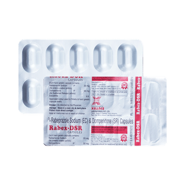 Rabex DSR Capsule is a combination of two medicines: Domperidone and Rabeprazole. This combination is used to treat acidity and heartburn or gastroesophageal reflux disease (GERD); a condition where the acid in the stomach flows back up into the food pipe (esophagus). It is also used to treat gastric and duodenal ulcers. Domperidone helps to control vomiting by increasing the movement of the gut, allowing the food to move more easily through the stomach.