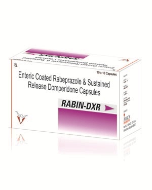 Rabin-DXR Capsule SR is a combination of two medicines: Domperidone and Rabeprazole. This combination is used to treat acidity and heartburn or gastroesophageal reflux disease (GERD); a condition where the acid in the stomach flows back up into the food pipe (esophagus). It is also used to treat gastric and duodenal ulcers. Domperidone helps to control vomiting by increasing the movement of the gut, allowing the food to move more easily through the stomach.