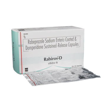 Rabiros D Capsule SR is a combination medicine used to treat gastroesophageal reflux disease (acid reflux). It works by relieving the symptoms of acidity, such as heartburn, stomach pain, or irritation. It also neutralizes the acid and promotes easy passage of gas to reduce stomach discomfort.Rabiros D Capsule SR should be taken on an empty stomach in the dose and duration advised by your doctor. The exact dose will depend on your condition and response to treatment. Continue taking it for as long as prescribed, even if your symptoms improve, as stopping early may cause them to return or worsen. Inform your healthcare provider about all other medicines you are taking, as some may interact with Rabiros D Capsule SR.