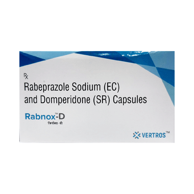 Rabnox-D Capsule SR is a combination of two medicines: Domperidone and Rabeprazole. This combination is used to treat acidity and heartburn or gastroesophageal reflux disease (GERD); a condition where the acid in the stomach flows back up into the food pipe (esophagus). It is also used to treat gastric and duodenal ulcers. Domperidone helps to control vomiting by increasing the movement of the gut, allowing the food to move more easily through the stomach.