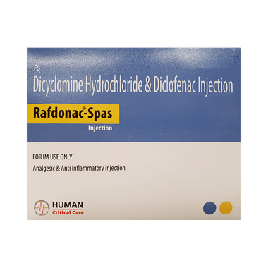 Rafdonac-Spas Injection is a combination medicine used in the treatment of abdominal pain. It works by reducing abdominal pain, discomfort, and cramps by relaxing the muscles of the stomach and gut. It also blocks certain chemical messengers that cause pain and fever.Rafdonac-Spas Injection is given by your doctor or nurse. The dose you are given will depend on your condition and how you respond to the medicine. You should keep taking Rafdonac-Spas Injection for as long as your doctor recommends. If you stop treatment too early, your symptoms may come back, and your condition may worsen.