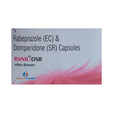 Ranil-DSR Capsule is a combination of two medicines: Domperidone and Rabeprazole. This combination is used to treat acidity and heartburn or gastroesophageal reflux disease (GERD); a condition where the acid in the stomach flows back up into the food pipe (esophagus). It is also used to treat gastric and duodenal ulcers. Domperidone helps to control vomiting by increasing the movement of the gut, allowing the food to move more easily through the stomach.