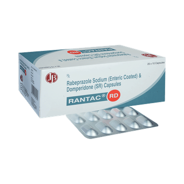 Rantac RD 30mg/20mg Capsule is a combination of two medicines: Domperidone and Rabeprazole. This combination is used to treat acidity and heartburn or gastroesophageal reflux disease (GERD); a condition where the acid in the stomach flows back up into the food pipe (esophagus). It is also used to treat gastric and duodenal ulcers. Domperidone helps to control vomiting by increasing the movement of the gut, allowing the food to move more easily through the stomach.