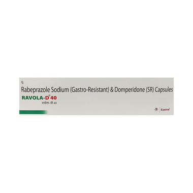 Ravola-D 40 Capsule SR is a combination of two medicines: Domperidone and Rabeprazole. This combination is used to treat acidity and heartburn or gastroesophageal reflux disease (GERD); a condition where the acid in the stomach flows back up into the food pipe (esophagus). It is also used to treat gastric and duodenal ulcers. Domperidone helps to control vomiting by increasing the movement of the gut, allowing the food to move more easily through the stomach.