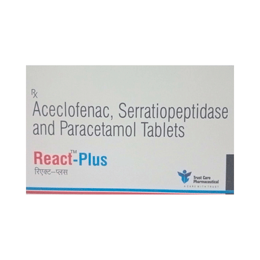 React-Plus Tablet is a combination medicine that relieves muscle, joint, and postoperative pain. It effectively alleviates pain and inflammation in conditions like rheumatoid arthritis, ankylosing spondylitis, and osteoarthritis.React-Plus Tablet should be taken at the dose and duration advised by your doctor. It should be taken with food or milk to prevent stomach upset. Taking the medicine regularly at the correct times increases its effectiveness. It is important to continue taking it until your doctor tells you it is safe to stop.