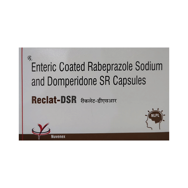 Reclat-DSR Capsule is a combination of two medicines: Domperidone and Rabeprazole. This combination is used to treat acidity and heartburn or gastroesophageal reflux disease (GERD); a condition where the acid in the stomach flows back up into the food pipe (esophagus). It is also used to treat gastric and duodenal ulcers. Domperidone helps to control vomiting by increasing the movement of the gut, allowing the food to move more easily through the stomach.