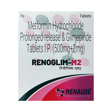 Renoglim-M2 Tablet PR is a combination of two medicines: glimepiride and metformin. This medicine is used in the treatment of type 2 diabetes mellitus (DM). It improves blood glucose levels in adults when taken along with a proper diet and regular exercise. Glimepiride lowers the blood glucose levels by increasing the release of insulin from the pancreas. Metformin works by lowering glucose production in the liver and improving insulin sensitivity. This combination is not indicated for the treatment of type 1 DM.