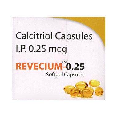 Revecium 0.25 Softgel Capsule is the active form of vitamin D. It increases the levels of vitamin D in your blood which in turn raises calcium levels in the blood by helping in the absorption of more calcium from your intestine. This way it helps in the treatment of calcium deficiency and metabolic bone disease.