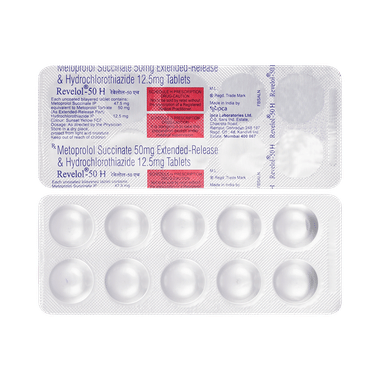 Revelol 50 H Tablet ER is used to treat hypertension (high blood pressure). It helps to control blood pressure when a single medication is not effective. It also helps to reduce chances of any future heart attack and stroke. Former treatment with this medicine improves chances of survival in patients of heart attack.Revelol 50 H Tablet ER is taken with or without food preferably in the morning to avoid frequent urination at night. Retain taking it for as long as advised by your doctor. Even if you feel well, do not stop this medicine on your own because high blood pressure often has no symptoms. If you stop taking it, your condition may get worse. Retaining active with regular exercise, reducing your weight and eating a healthy diet will also help control your blood pressure. Follow your doctor’s advice while taking this medicine.
