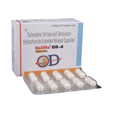 roliFLO OD 4 Capsule ER is a combination of two medicines. It is used in the treatment of benign prostatic hyperplasia. It helps relax the muscles of the bladder and prostate gland, thereby relieving pain and irritation while urinating. It also helps control the urge to urinate.roliFLO OD 4 Capsule ER may be prescribed alone or in combination with other medicines. roliFLO OD 4 Capsule ER may be taken with or without food. Take it regularly and take it at the same time each day for the best result. Do not use it for a longer duration than recommended by your doctor. You should not stop taking the medicine until your doctor tells you it is okay to stop.